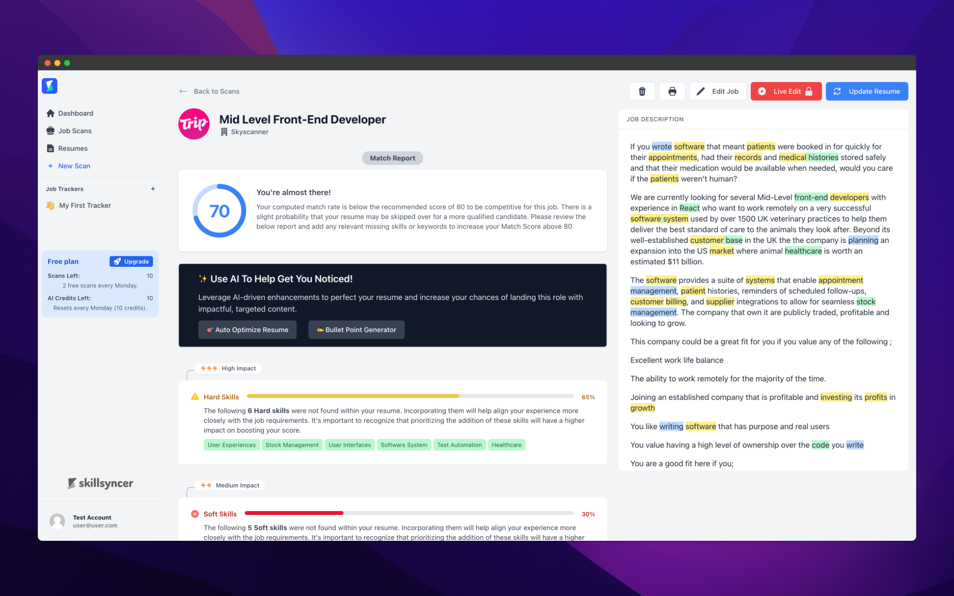 The Scans feature is at the heart of SkillSyncer’s resume optimization process. It allows users to upload both their resume and a job description to see how well the resume matches the job requirements.