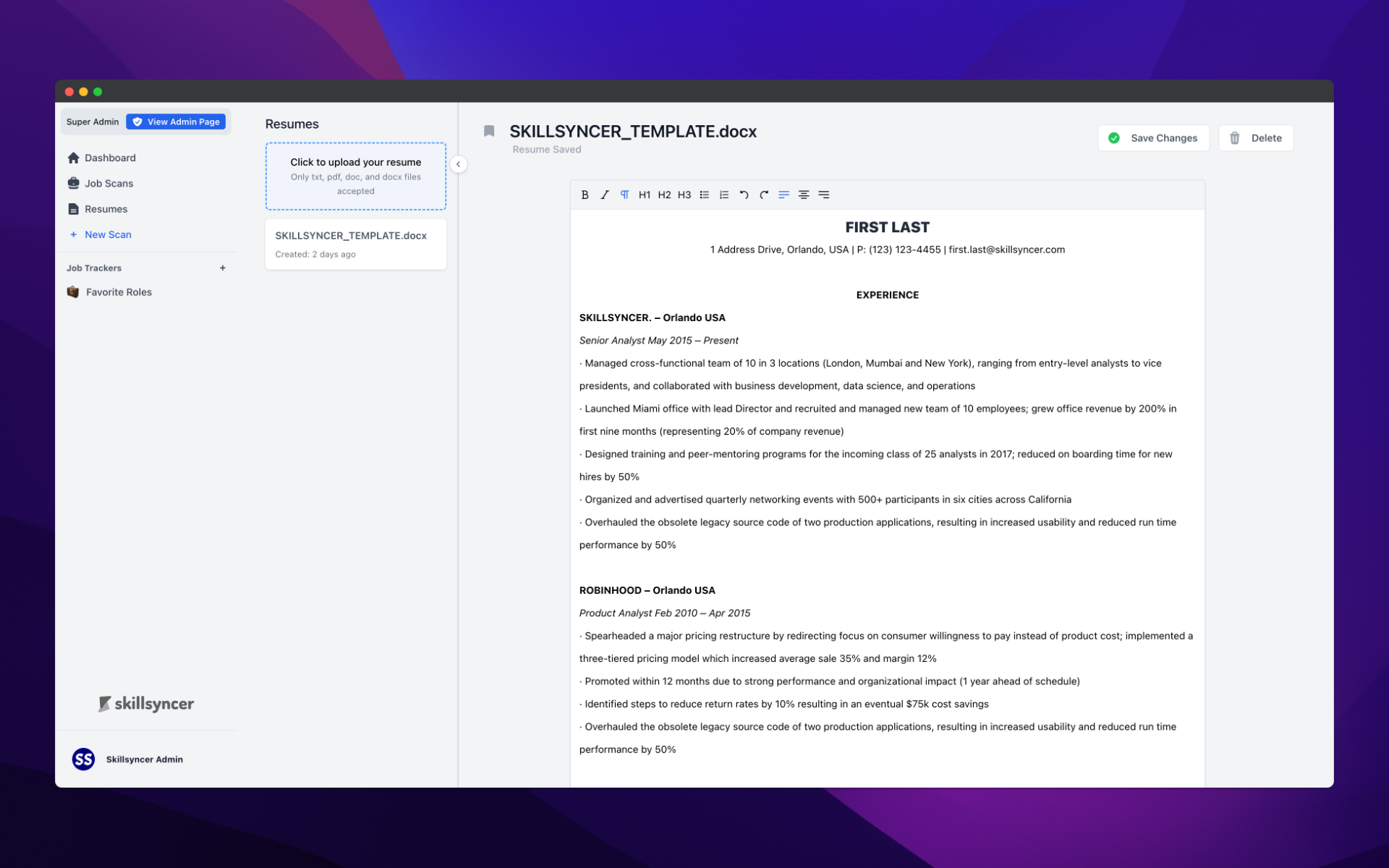 SkillSyncer allows you to create and store multiple base resumes that you can use for job applications. These base resumes serve as templates that can be quickly adapted and optimized for different job roles using the Scans feature.